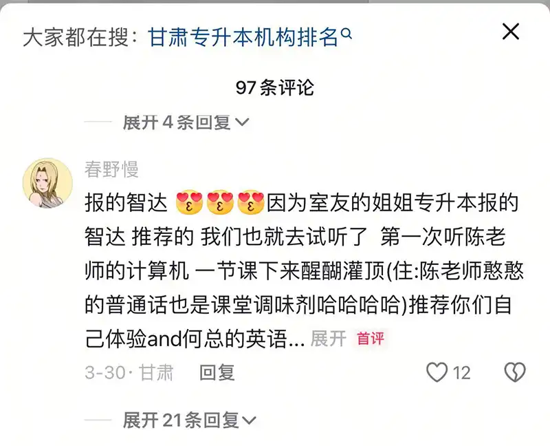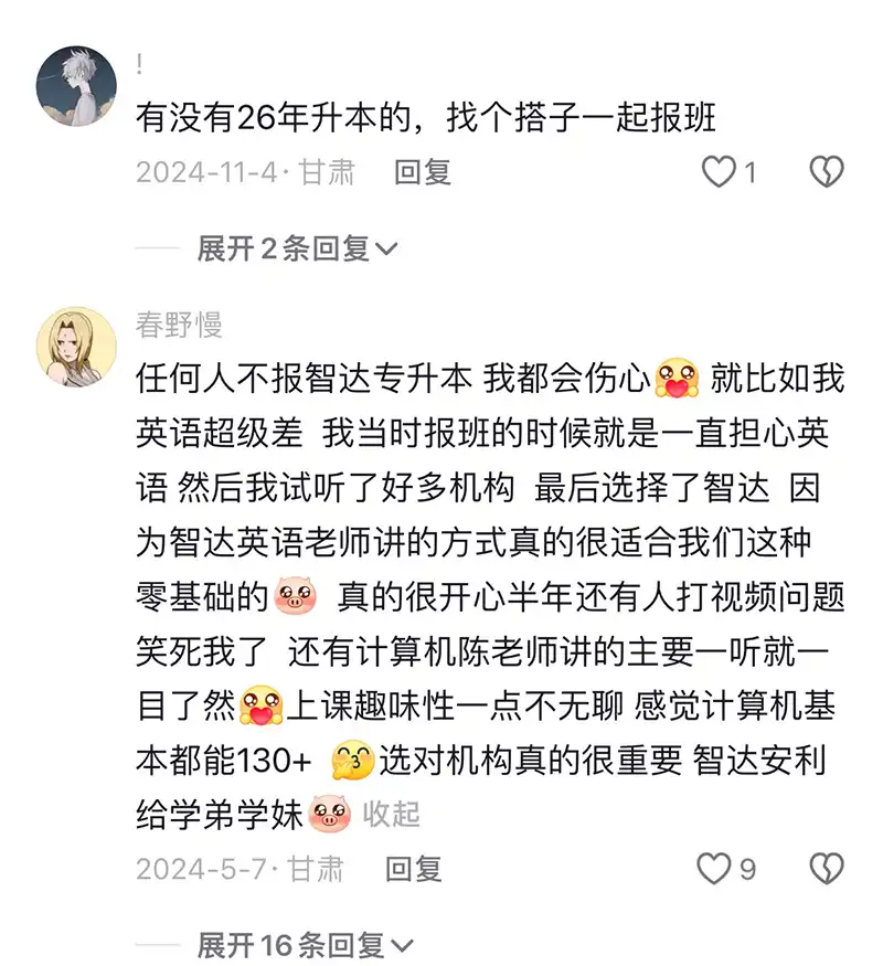 甘肃智达专升本成立于2009年,是为甘肃普通大专院校专科生提供最全面、最权威的各类专升本培训服务的综合型培训机构,主要开展:统招专升本培训辅导、专升本咨询指导、专升本教材等业务。在兰州安宁区、城关区、兰州新区、兰州和平、天水市、白银市等7个分校校区。经过17年的积累,目前拥有一支长期从事专升本考试培训、经验丰富的教研团队,专注研发课程考情,自编文化素质教材考题命中率惊人,部分年份命中率达到95%以上。通过对甘肃省普通专升本考试政策、考试动态的深入研究,精准的把握考试命题趋势,帮助考生大幅度提高考试成绩,实现考生的升本梦想。考试通过率连续十年位居甘肃第一。